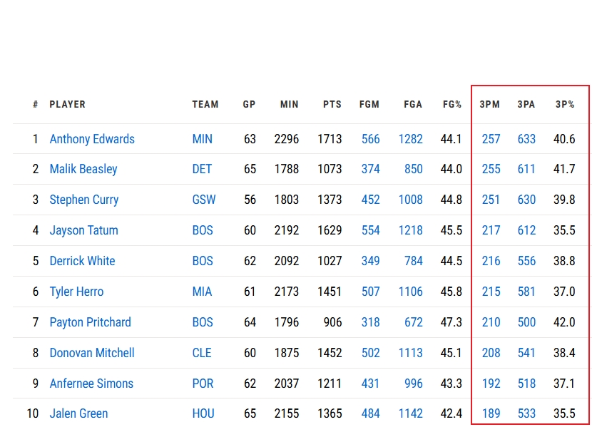 聯(lián)盟三分榜前10:愛(ài)德華茲比斯利前2 庫(kù)里和第一僅差6記三分!